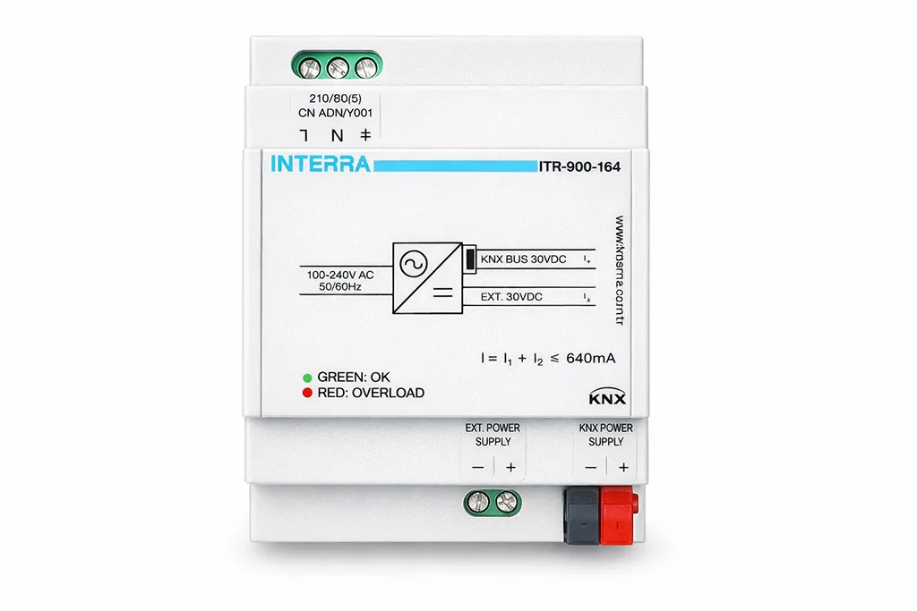 منبع تغذیه کی ان ایکس اينترا با کد ITR900-0164 يک منبع تغذیه تخصصی برای سامانه های مبتنی بر کی ان ایکس است که با جريان نامی ۶۴۰ ميلي آمپر معرفی شده و دارای خروجی کمکی با ولتاژ ۳۰ ولت دی سی است. در معماری کی ان ایکس، تامين برق و پايداری ولتاژ باس از مهمترين بخش های اجراست، چون تمام تجهيزات متصل به باس برای ارتباط و کارکرد صحيح به تغذيه مناسب نياز دارند. به همين دليل، منبع تغذیه کی ان ایکس يک قطعه عمومی مانند منابع تغذیه معمولی نيست و انتخاب آن بايد مطابق ظرفيت خط و تعداد تجهيزات باشد.